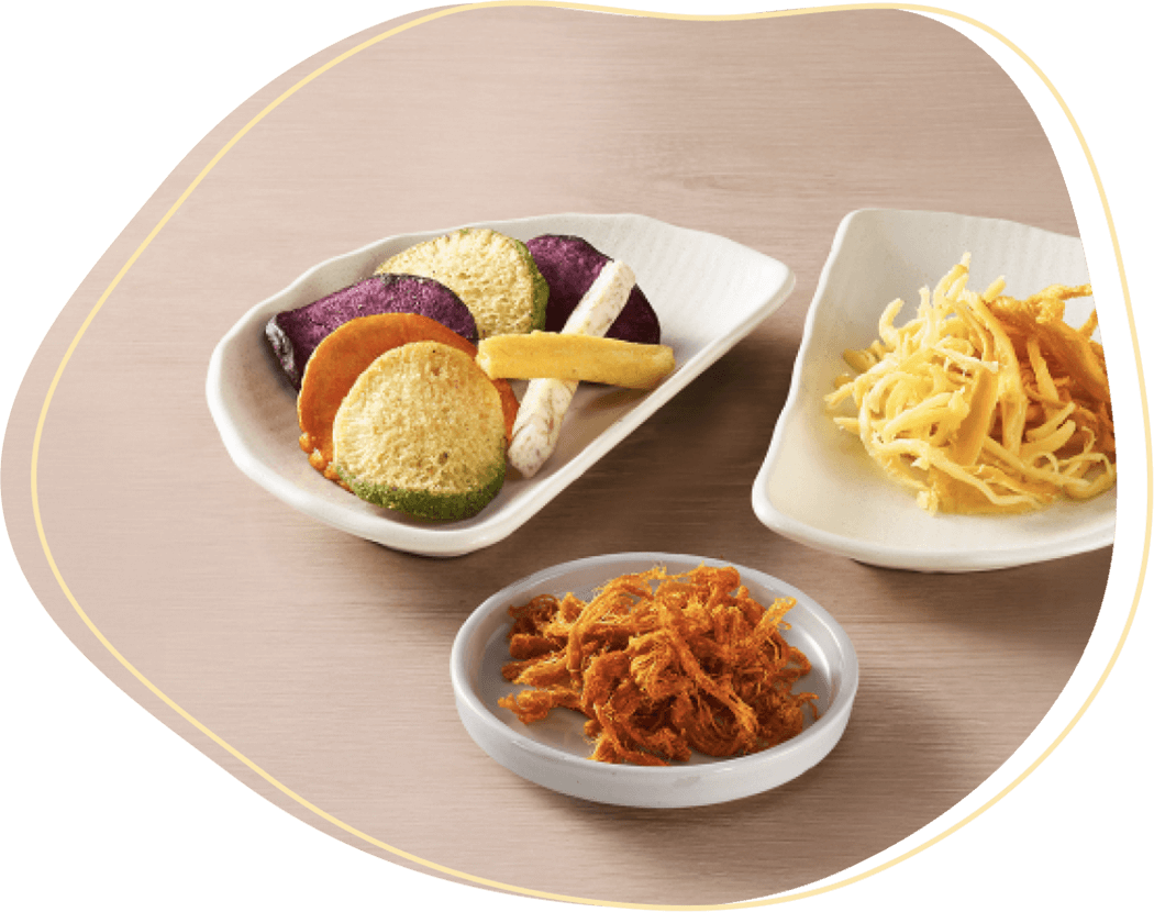 原味乳酪絲、辛味乳酪絲、曼波肉絲、田園蔬菜脆片、七里香蜜汁肉乾、黑芝麻鱈魚條、水燦林甘薯條、南島秀珍菇脆片、漁翁島烤魷魚絲