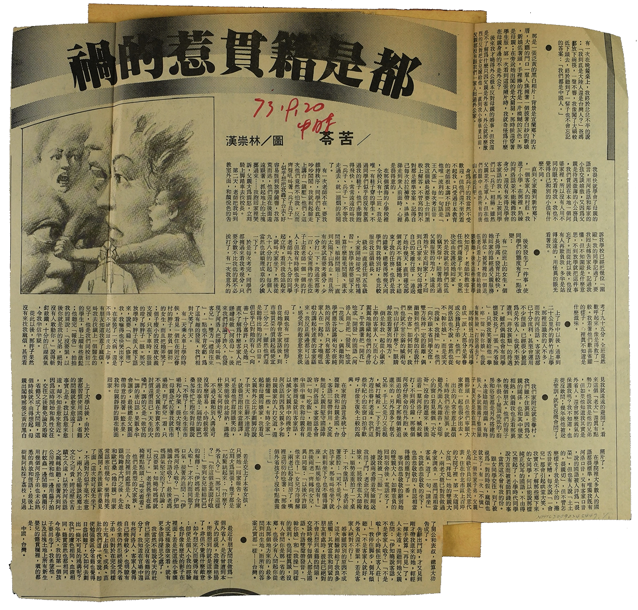 苦苓〈都是籍貫惹的禍〉剪報,1984年刊登於《中國時報》。苦苓講述自己的家庭背景,爸爸是中國東北的滿人,母親是宜蘭人,他曾經在新竹讀書,在各種族群(閩南、客家與外省)的文化衝突下長大。這篇文章最後用積極的「中國臺灣」認同來總結「籍貫」的認同差異。