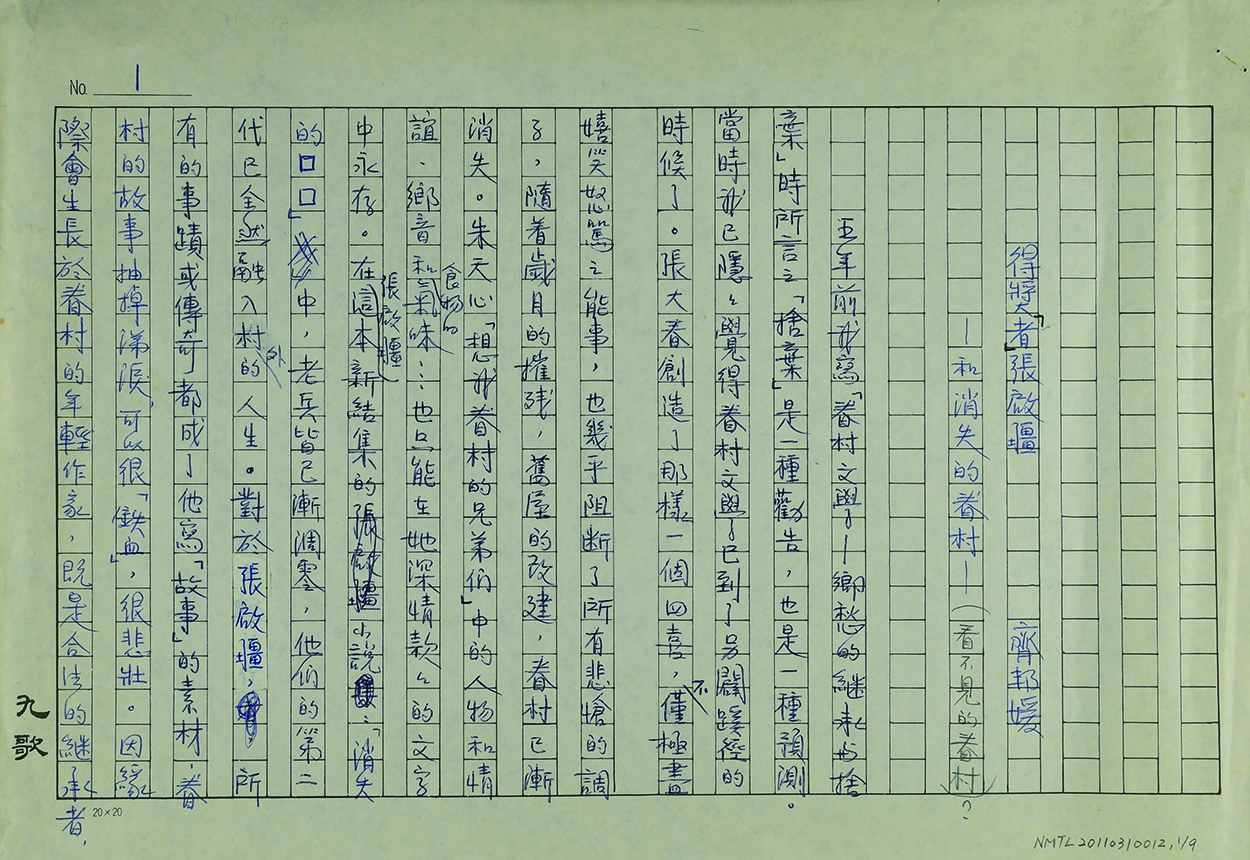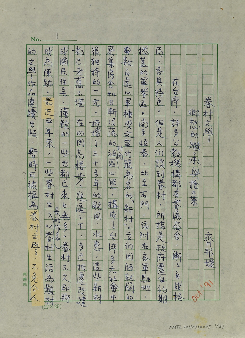 齊邦媛〈眷村文學:鄉愁的繼承與捨棄〉手稿,探討眷村文學的形成,與評析多篇眷村文學作品。齊邦媛描述戰後移民第二代作家於眷村成長,並繼承了父母輩的鄉愁,以及融合臺灣風土的記憶,形成非常特殊的眷村文學風景。