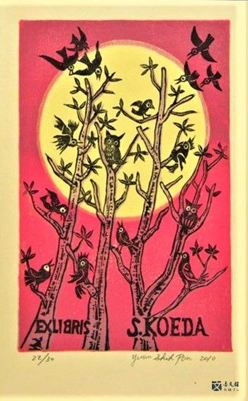 潘元石是藏書票收藏家也是創作者,這是潘元石製作的藏書票─Birds, all friends(鳥、眾友)
