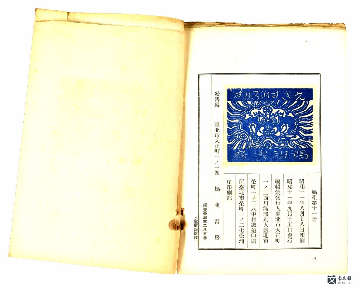 《媽祖》第十一冊。《媽祖》雜誌的幀裝過程極為繁複,西川滿在雜誌內頁使用日本進口和紙,