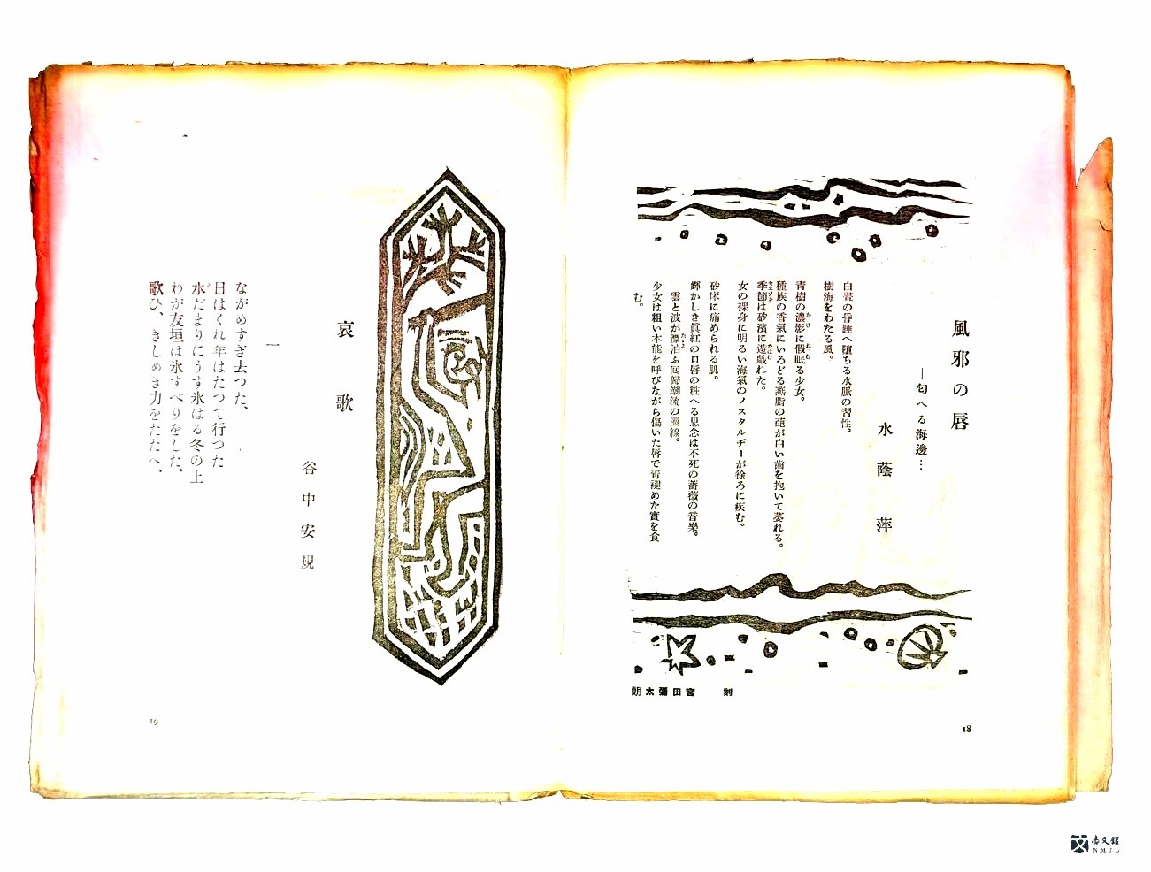 媽祖第二卷第二冊──詩?版畫百花春》裡收錄楊熾昌風邪〈風邪?唇〉,搭配宮田彌太郎所刻的版畫。